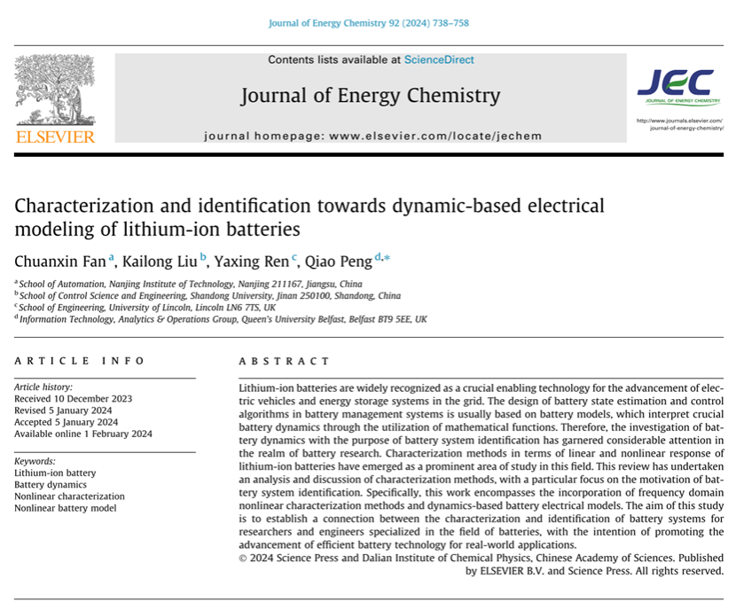 近日,我校自动化学院范传鑫博士以第一作者身份、凯发k8官网为第一署名单位,与山东大学刘凯龙教授、英国林肯大学任亚星博士、英国贝尔法特女王大学彭琦奥博士深度合作,在国际权威期刊《Journal of Energy Chemistry》上发表了综述论文:“Characterization and identification towards dynamic-based electrical modeling of lithium-ion batteries”。该期刊是中科院化学一区TOP期刊,涉及领域包括能源与燃料、工程化工、应用化学等,影响因子13.1