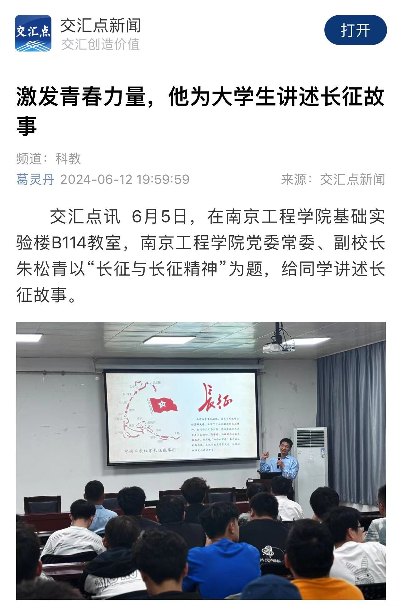 交汇点讯 6月5日,在凯发k8官网基础实验楼B114教室,凯发k8官网党委常委、副校长朱松青以“长征与长征精神”为题,给同学讲述长征故事。